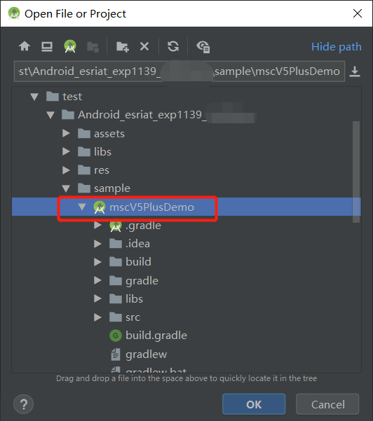 打开Android Studio,在菜单栏File--->new--->import project当前解压sdk路径,使用离线服务能力选择导入mscV5PlusDemo,如下图所示: