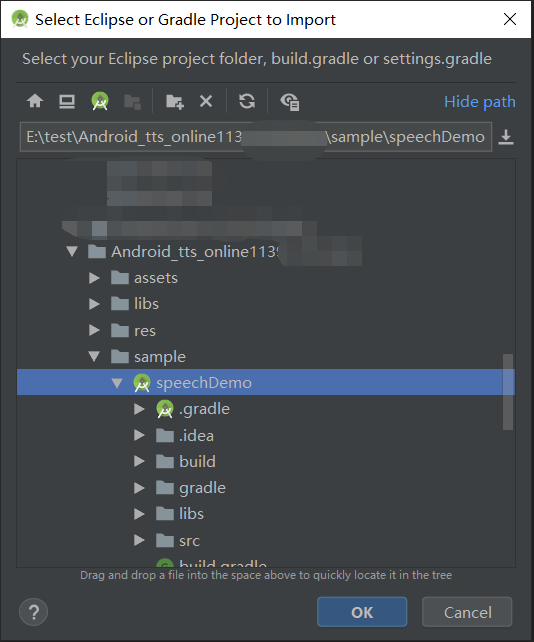 打开Android Studio,在菜单栏File--->new--->import project当前解压sdk路径,使用在线服务能力选择导入SpeechDemo,如下图所示:
