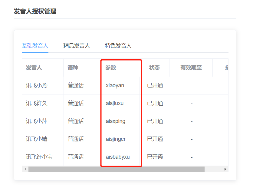 合成语音的语言,方言和特征基本由发音人决定——即不同的发音人,支持不一样的语言、方言和特征,合成发音人列表请到控制台-我的应用-语音合成-在线语音合成(流式版)-发音人授权管理处查看,部分发音人支持添加试用,添加后即可查看发音人参数值。如下图: